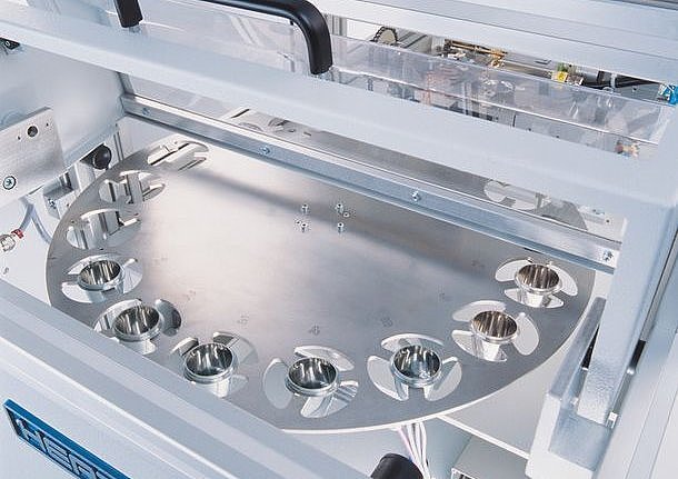 After the glass bead has cooled down, it is removed from the dish by a vacuum suction gripper. The finished bead sample can either be made available to the operator in the turntable magazine or sent to the spectrometer via a conveyor belt. This makes the fusion machine the perfect first step towards automation.