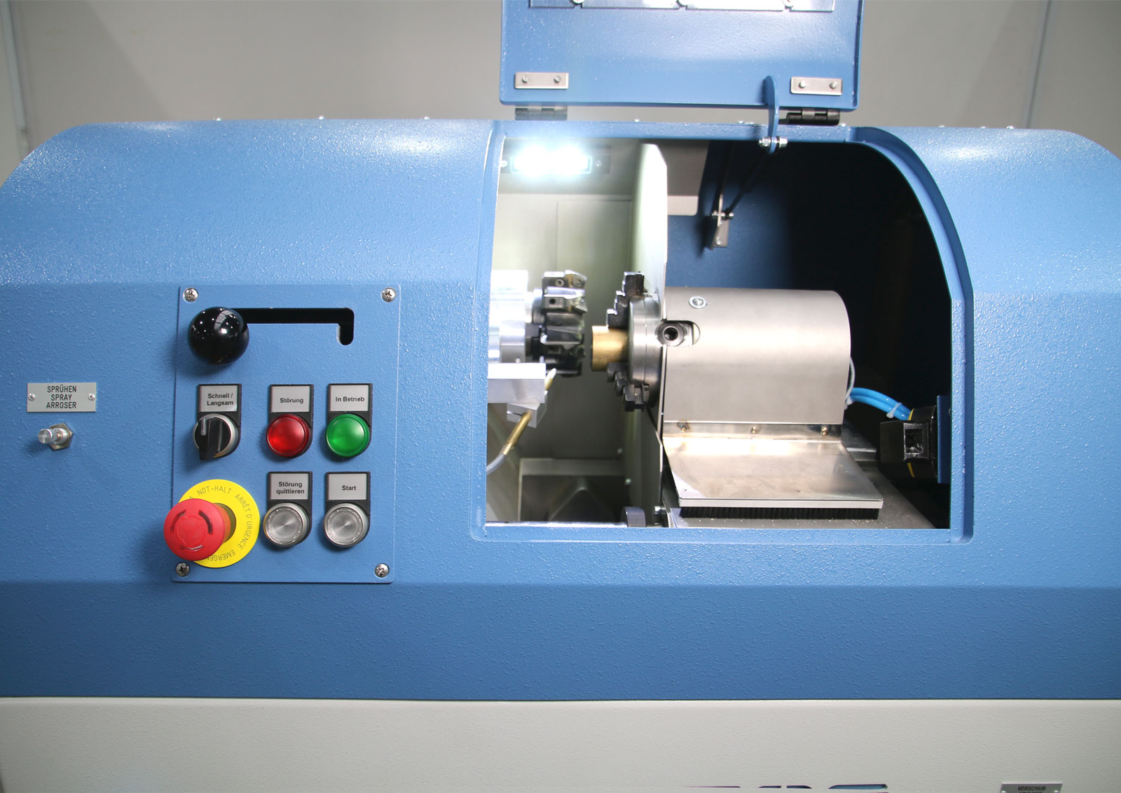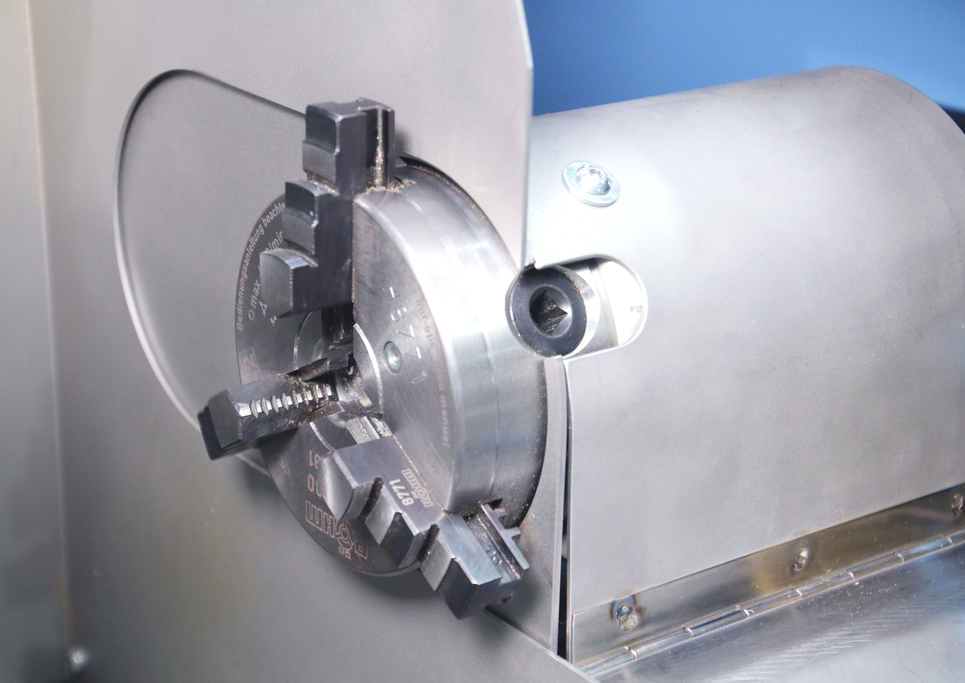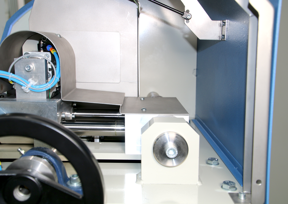 The HAF/2 has an input flap, which can be easily opened with the help of a gas pressure spring and held securely in the open position. The milling chamber of the HAF/2 has a large opening. This makes it particularly easy for the operator to clamp the specimen in the chuck and adjust the milling depth. The three-jaw chuck allows the clamping of specimens with different geometries up to a diameter of 70 mm. After closing the input flap, the milling process is simply started at the touch of a button. The lining of the milling chamber has been designed in such a way that the chips are effectively discharged and collected in the drawer positioned below. The removal of the chips from the milling room is supported by an extraction system (optional), which is mounted inside the machine. The side cover can be removed in a few simple steps, so that the machine room is freely accessible for cleaning and maintenance activities.