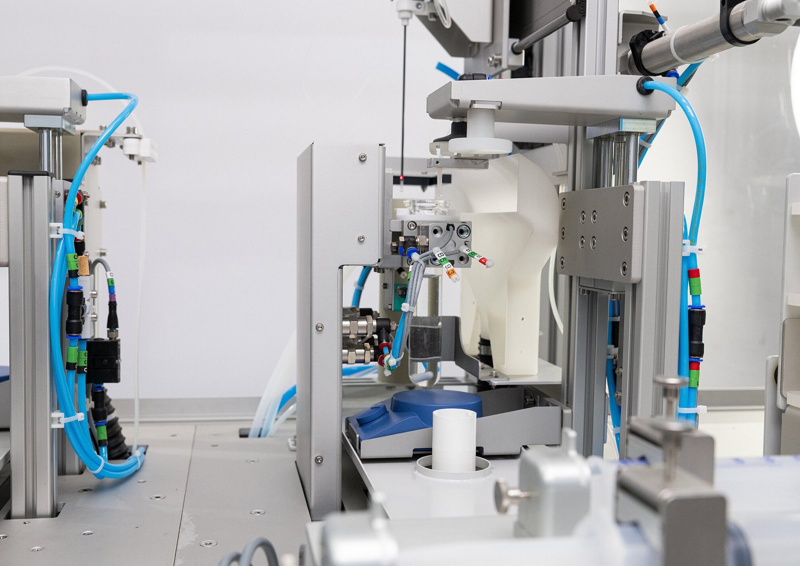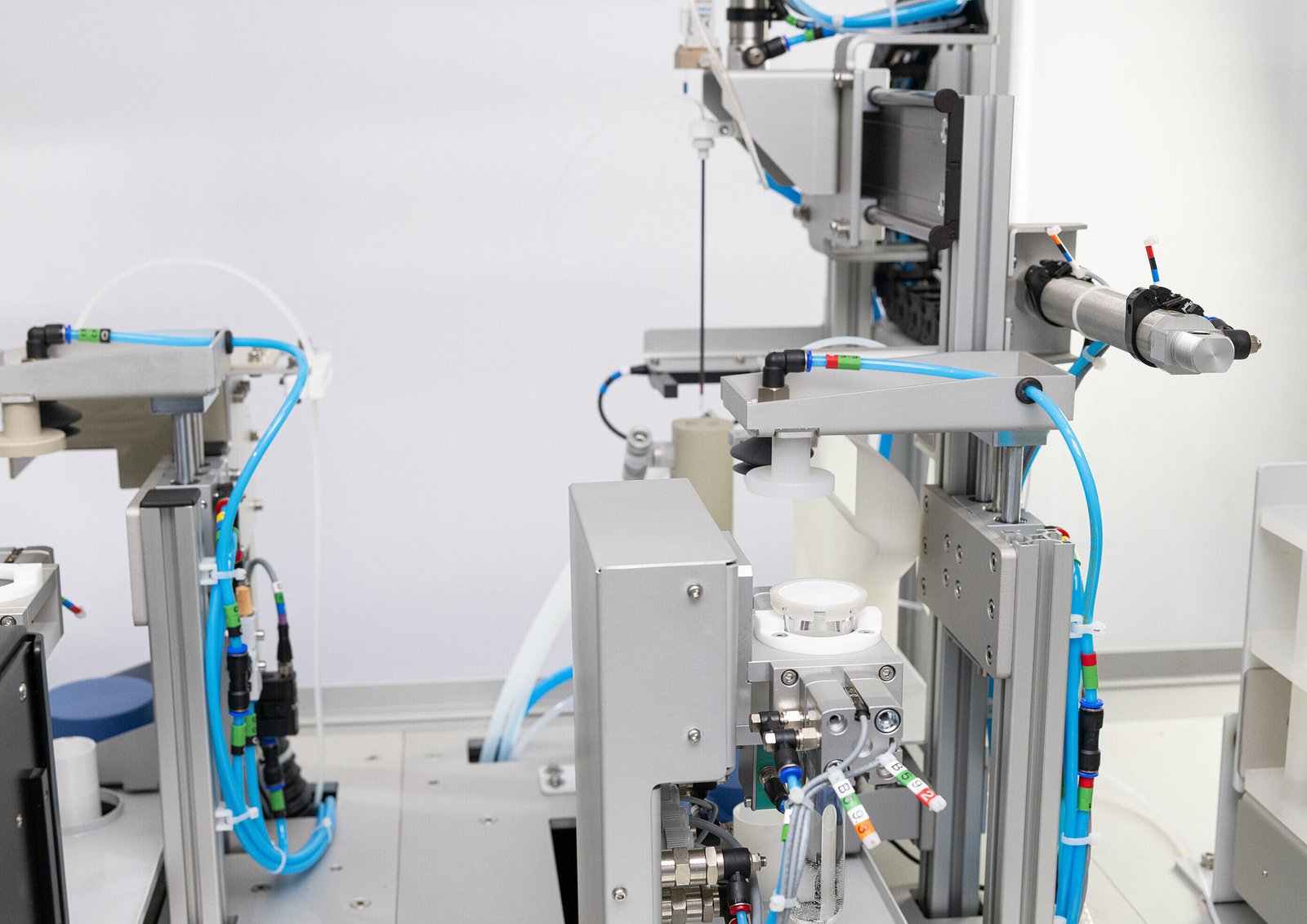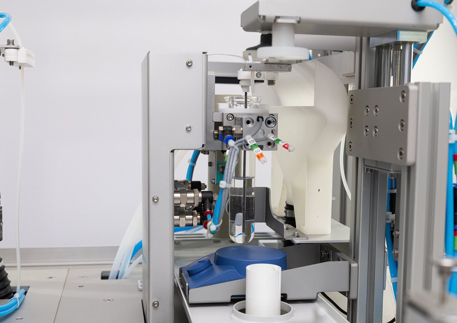 To prevent contamination, liquid transfer is performed exclusively via high-purity, chemically resistant tubing. After each transfer, the tubing system and dispensing needle are rinsed with suitable cleaning fluids.