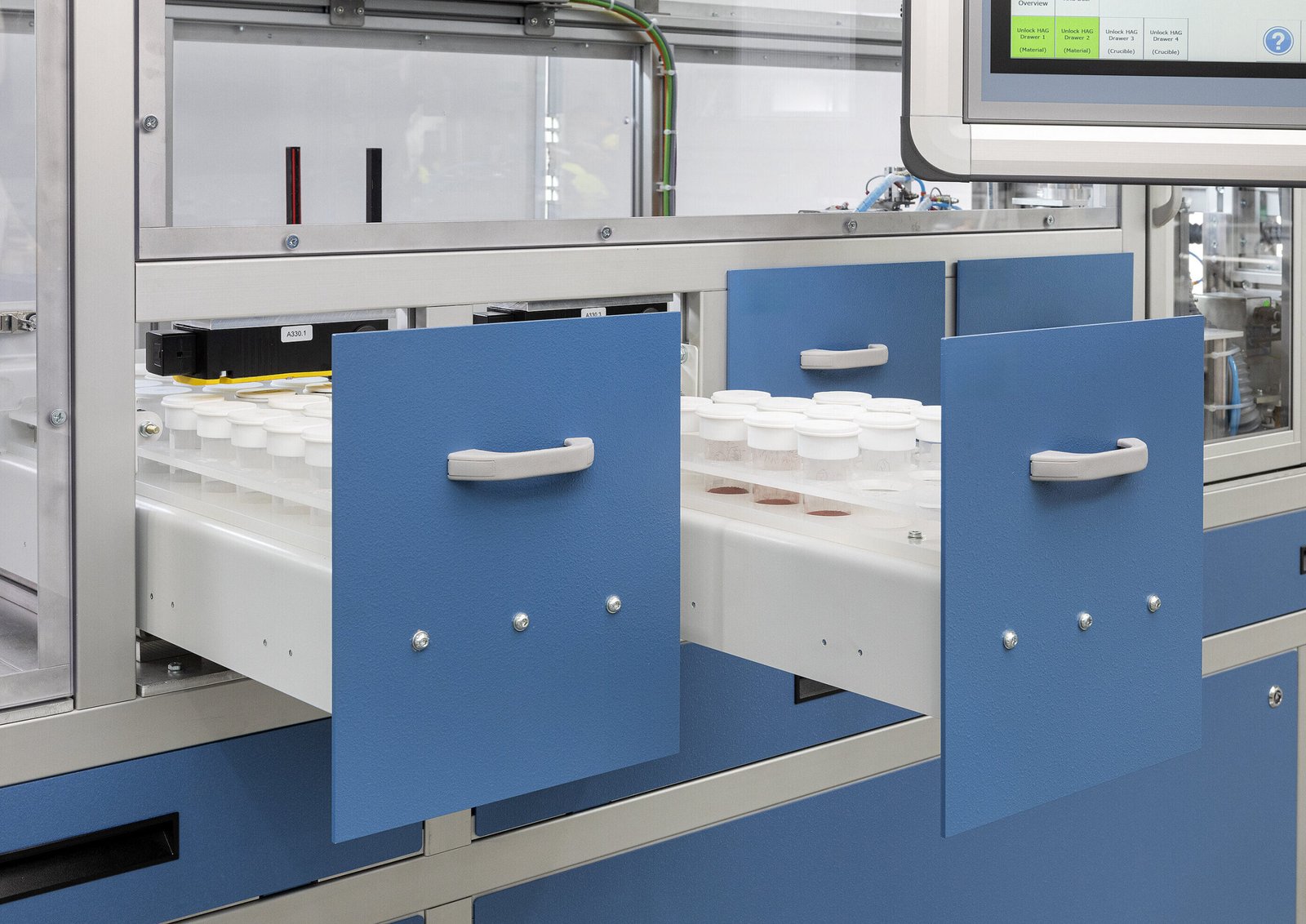 Sample beakers, crucibles and dishes can be handled either by a multi-axis robot or a portal system, depending on the customer’s requirements. If crucibles and sample beakers are fed via drawer magazines, the portal system is used for handling.