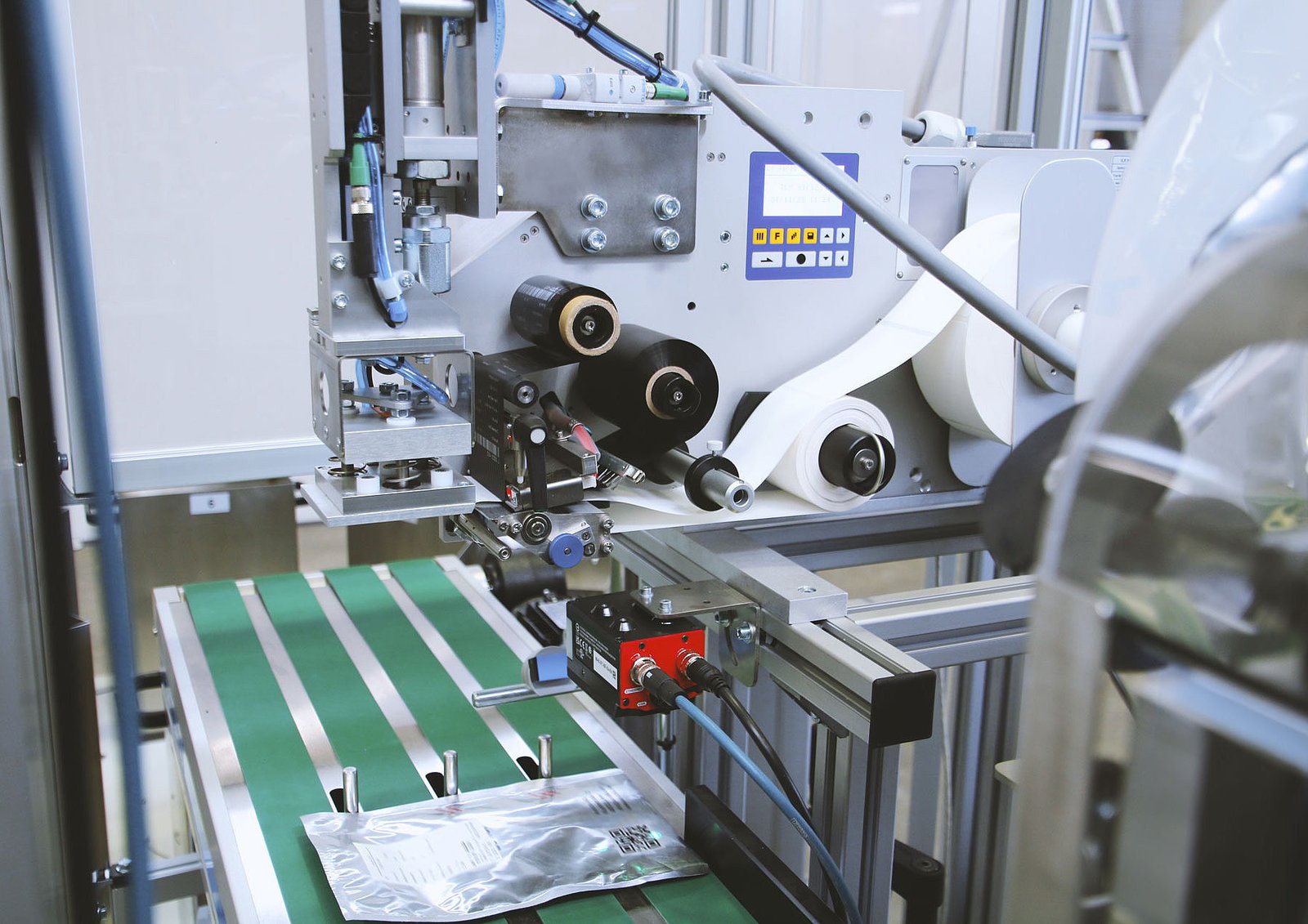The packaging machine is usually combined with a label printer. The filled bags can be discharged into a magazine configured to the customer’s requirements and stored there until removed by an operator. The length of the discharge conveyor and the function of the output magazine can be adapted to the customer’s requirements.