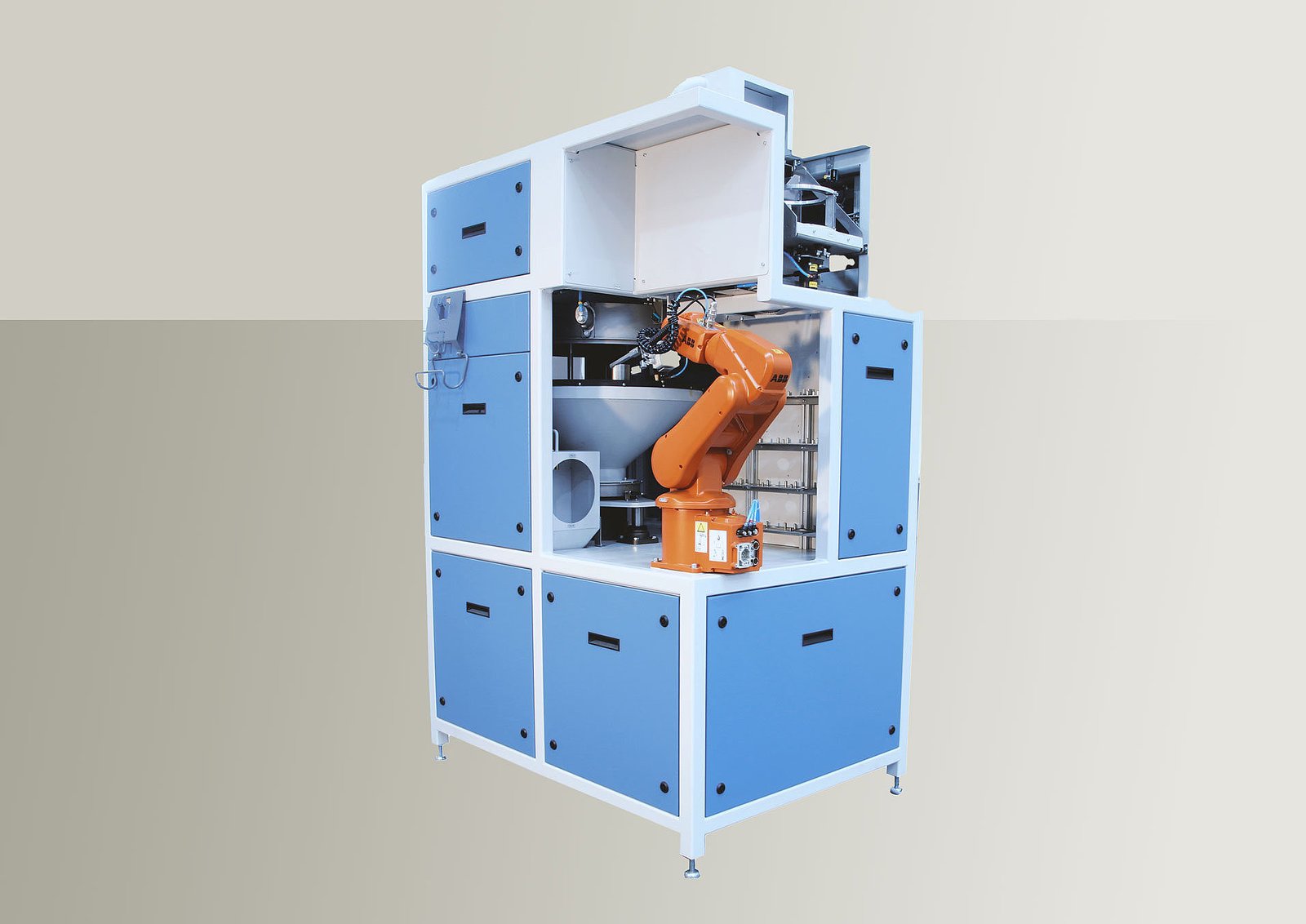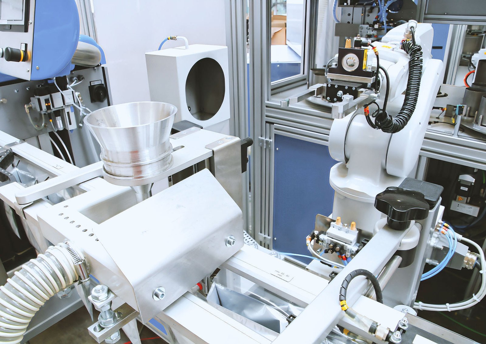 The HP-BVM enables the fully automatic packaging of powdered, ground or crushed samples in bags. The bags are then automatically closed, sealed and labeled. The sample material is fed into the bags by a robot. This takes the sample material in a cup and pours it into the bag positioned below it via a funnel. Vibrators ensure that the cup is emptied into the bag without leaving any residue.