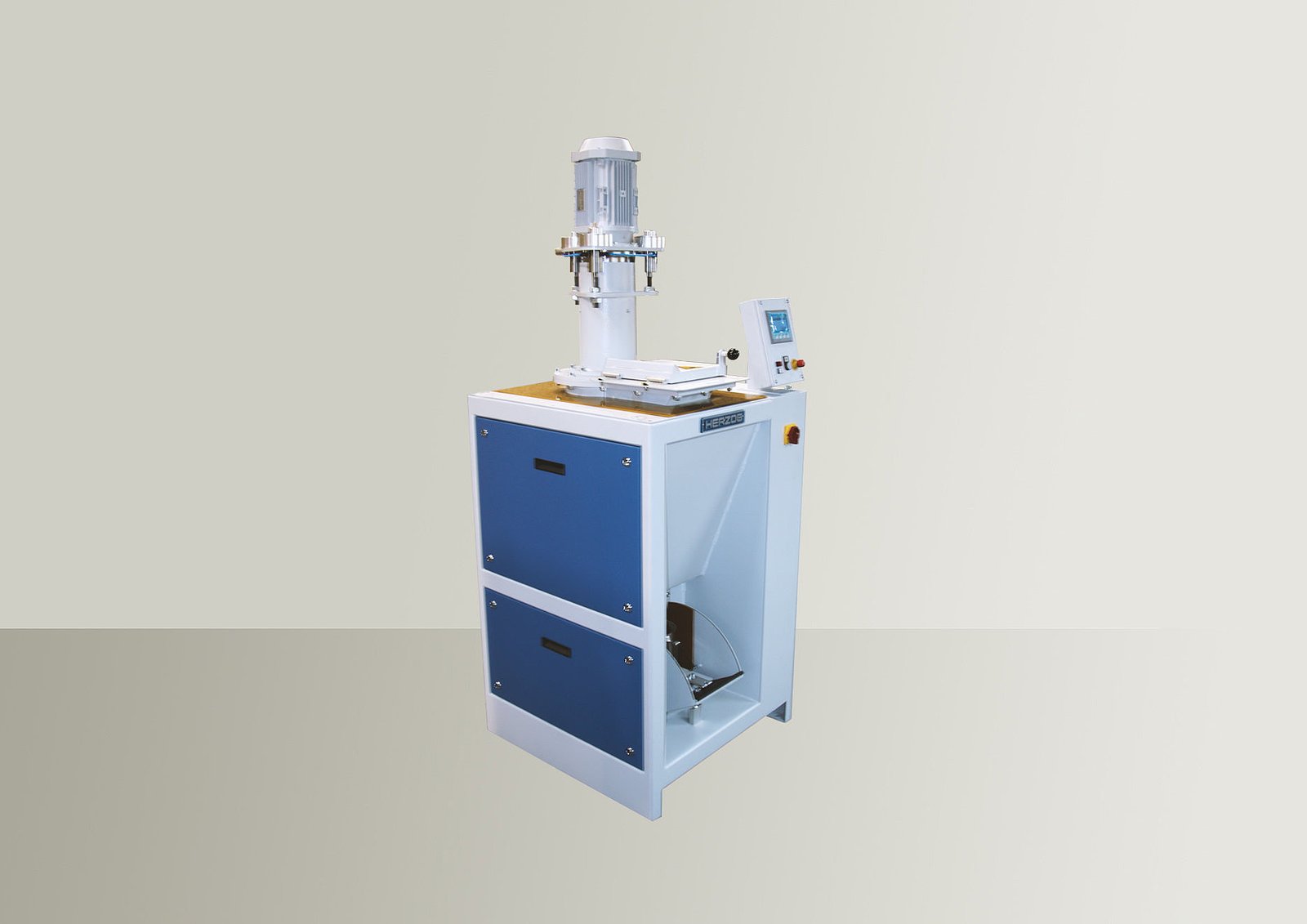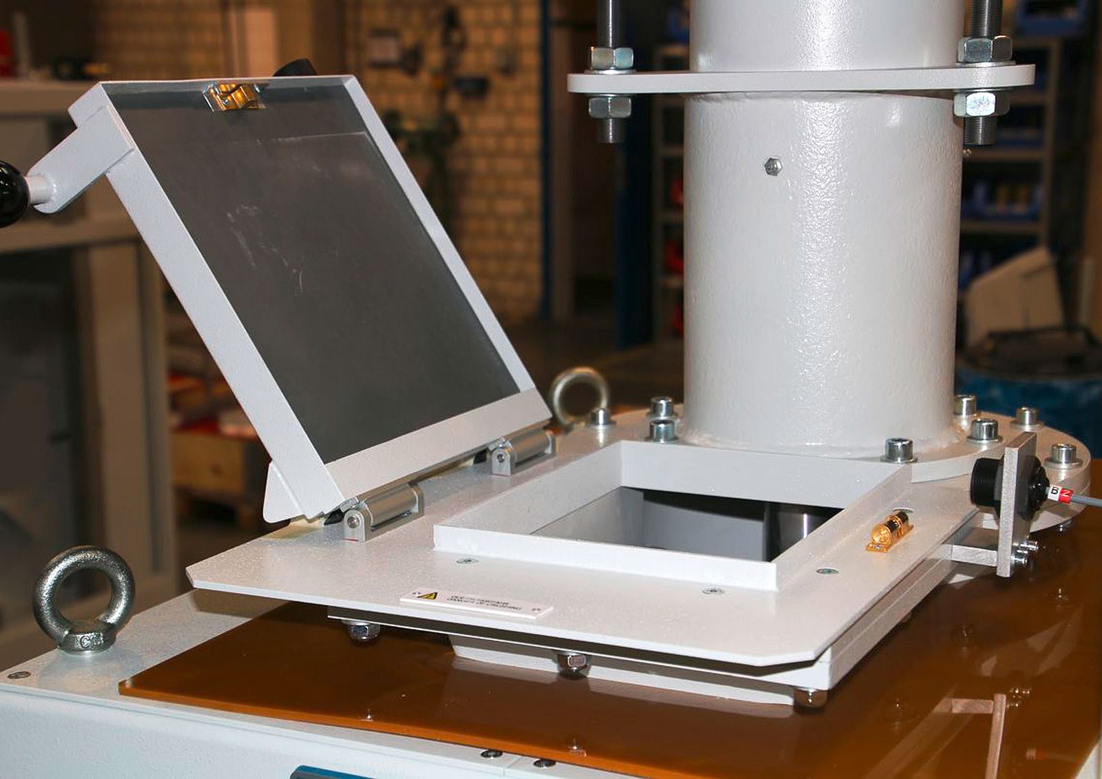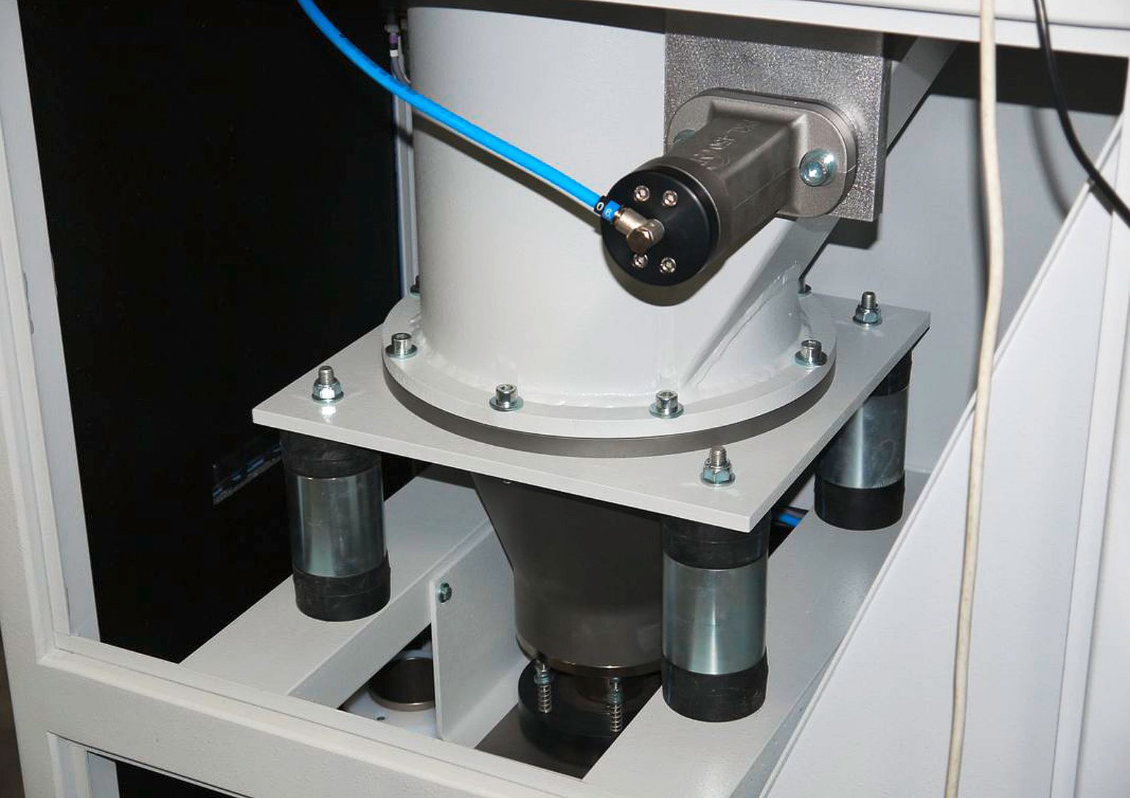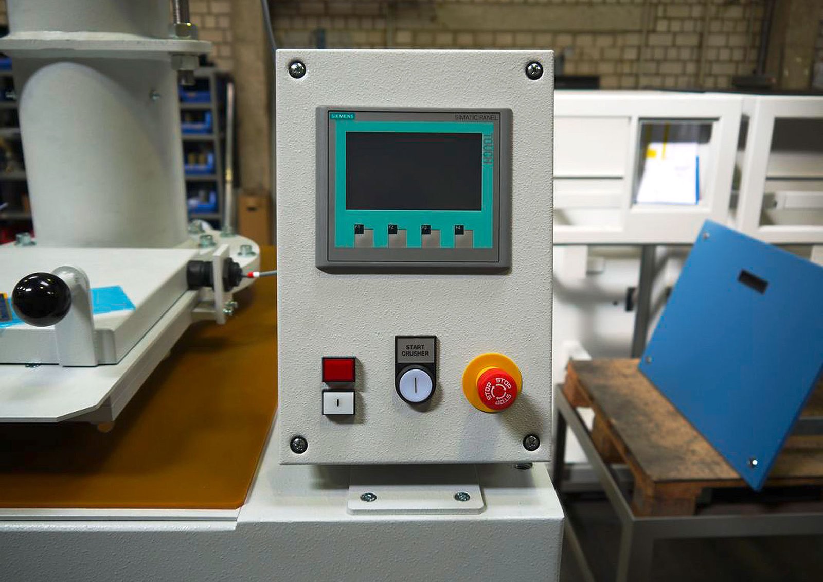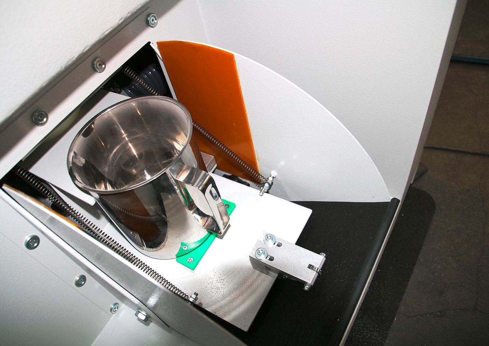 The crushed material is caught in a container positioned below the mortar crusher output. After crushing is finished the container is transported to the output position and is ready for further material handling. Simultaneously, the automated compressed air cleaning cycle of the machine is initiated.