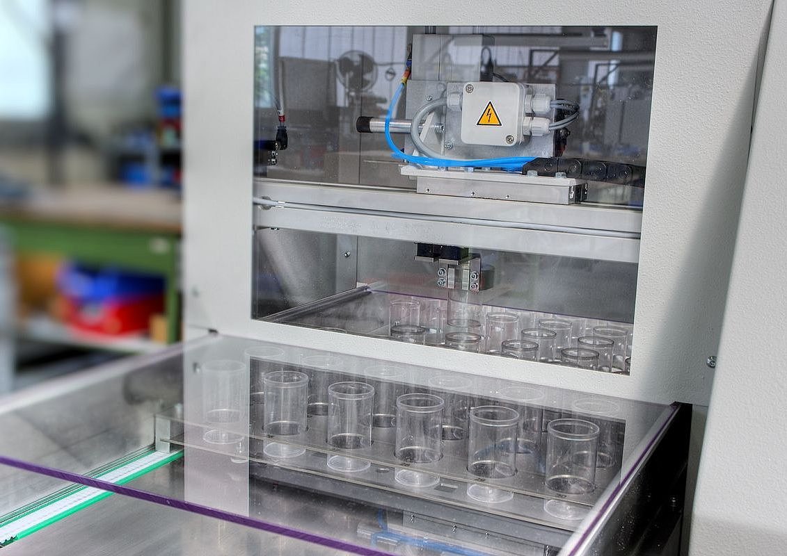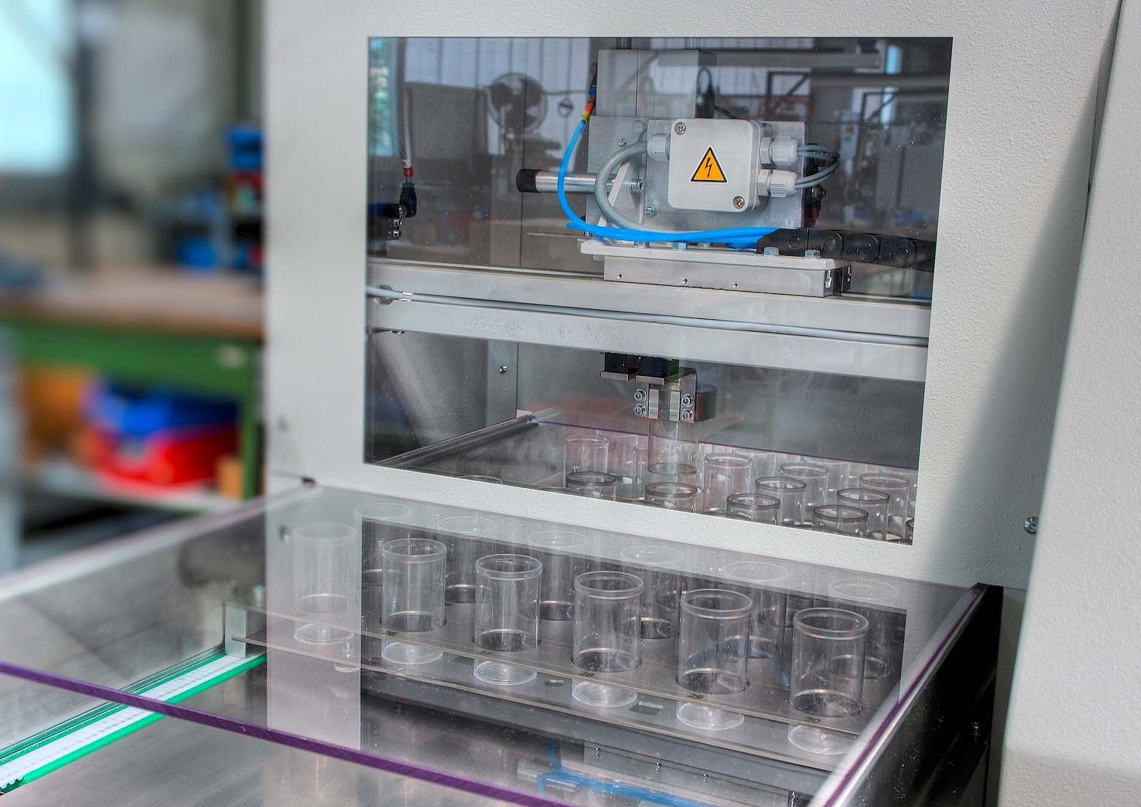 The device is used to dose a defined mass into plastic beakers. The beakers are presented in trays with 30 positions. Ther is space for a total of 3 trays on the feed conveyor. 60 beakers can be dosed without the intervention of the operator. The HP-DT2 is the optimal machine to release the laboratory personnel from mundane tasks, to improve the accuracy of dosing and guarantee a high sample throughput.