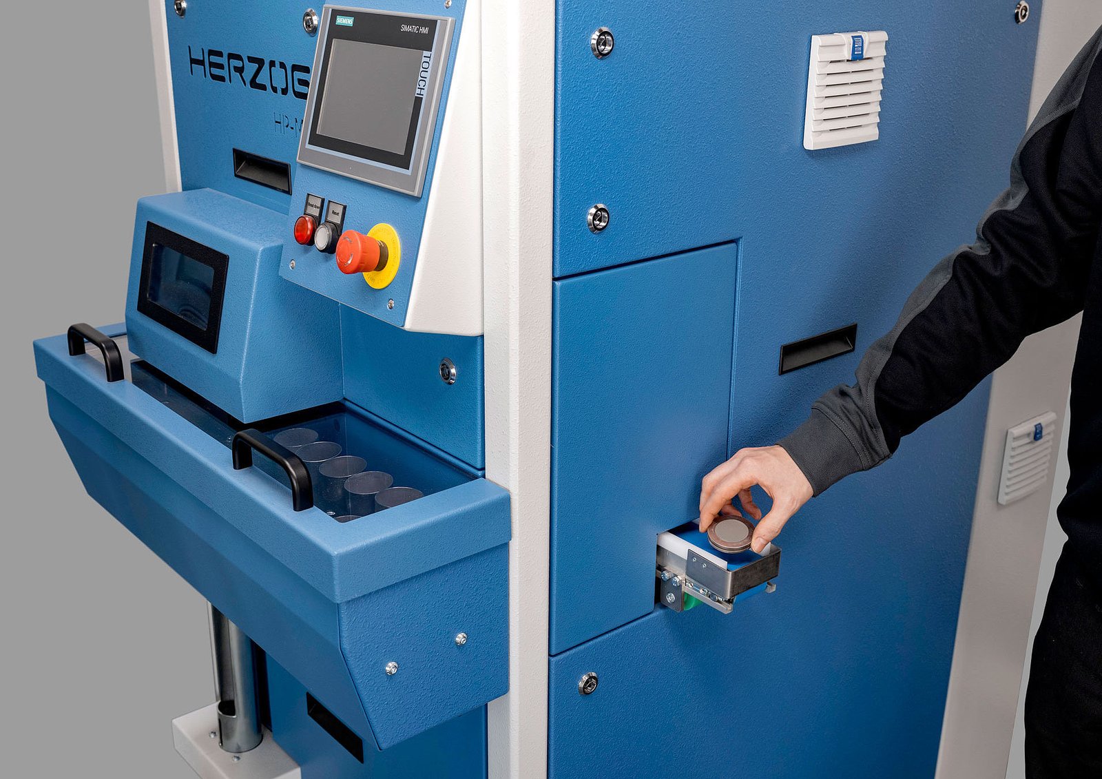 High priority was the design of a versatile machine that is deployable in many different configurations. As a stand- alone machine, the HP-MP can be operated with an input and output device where the operator inserts a single cup and removes the pressed pellet.