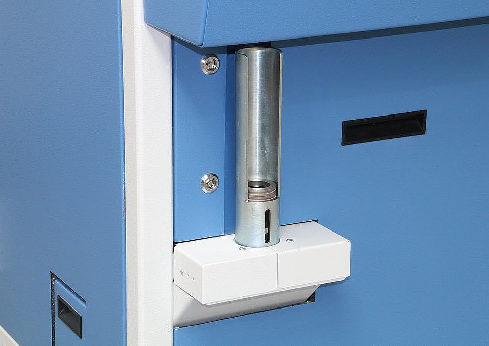 A 23-position magazine is available as an option to enable automatic batch processing of samples. The finished pressed tablets are collected in an output magazine attached to the side of the machine. Depending on the operator’s choice, the cup can be returned empty to the magazine or filled with retained material for further sample processing or analysis.
