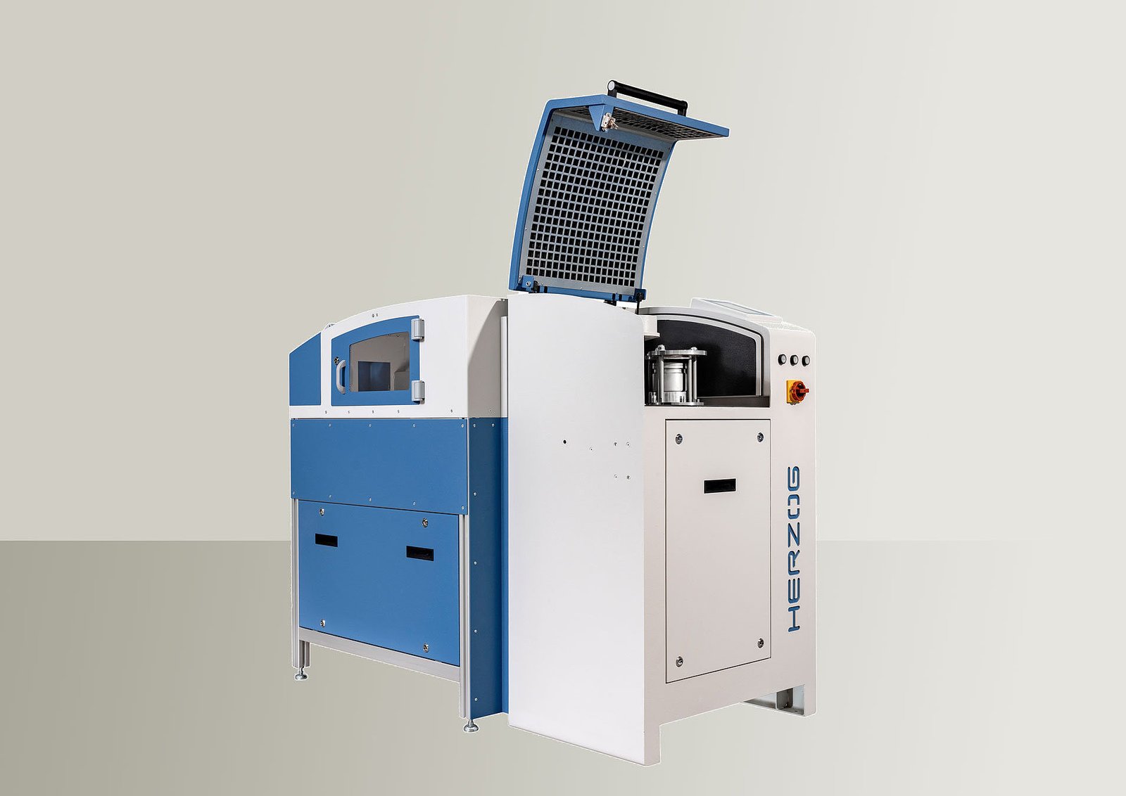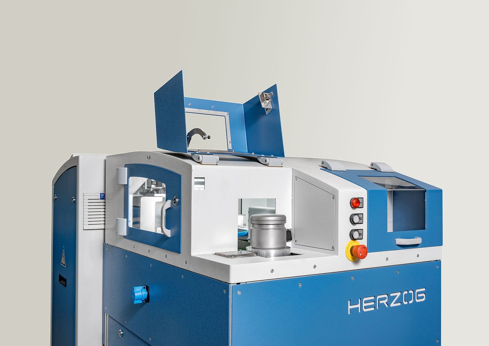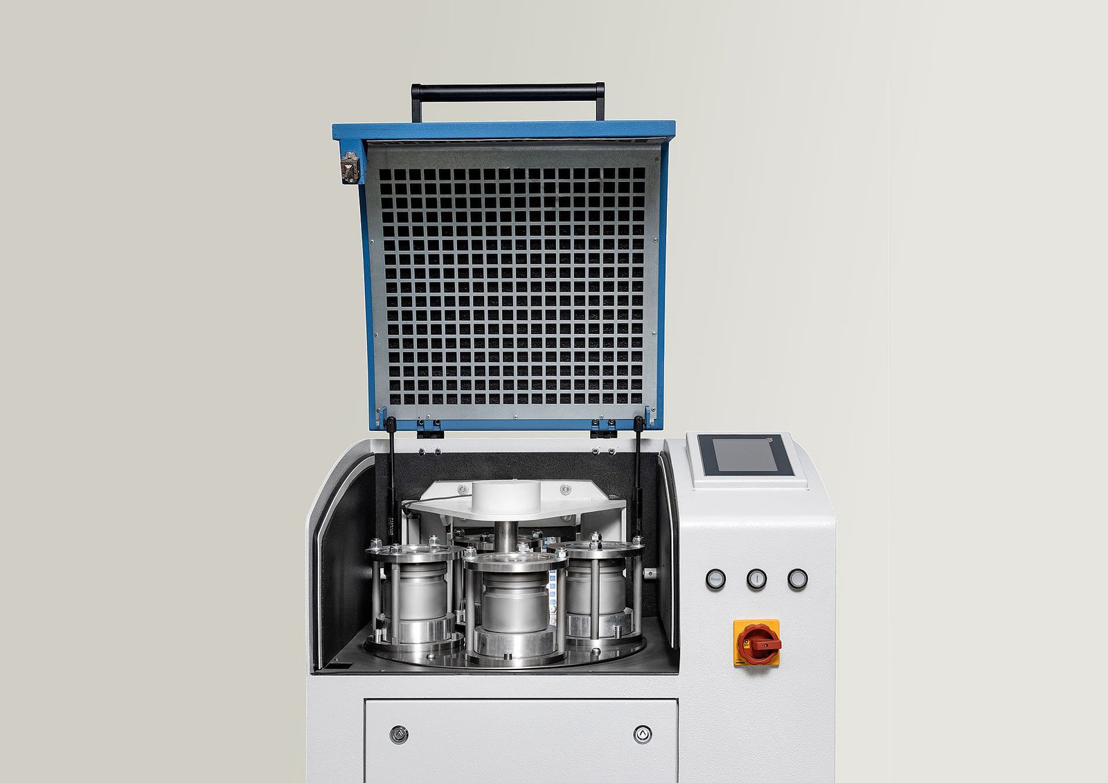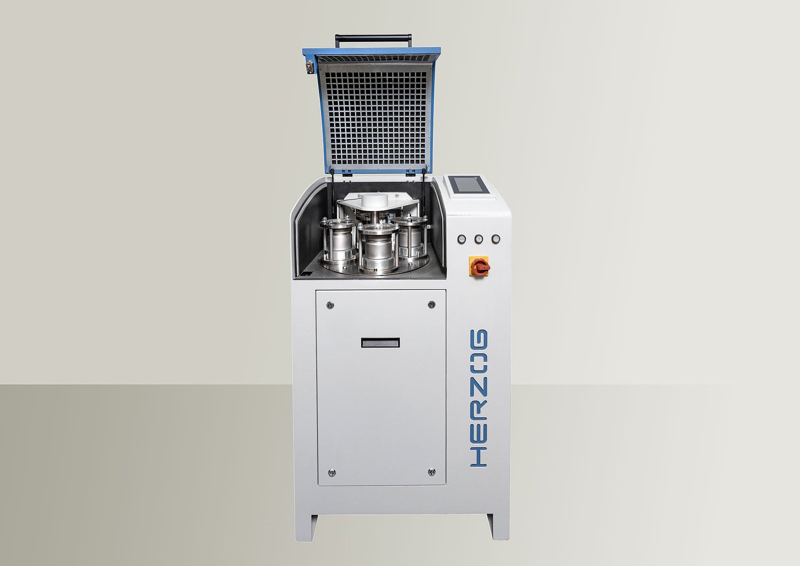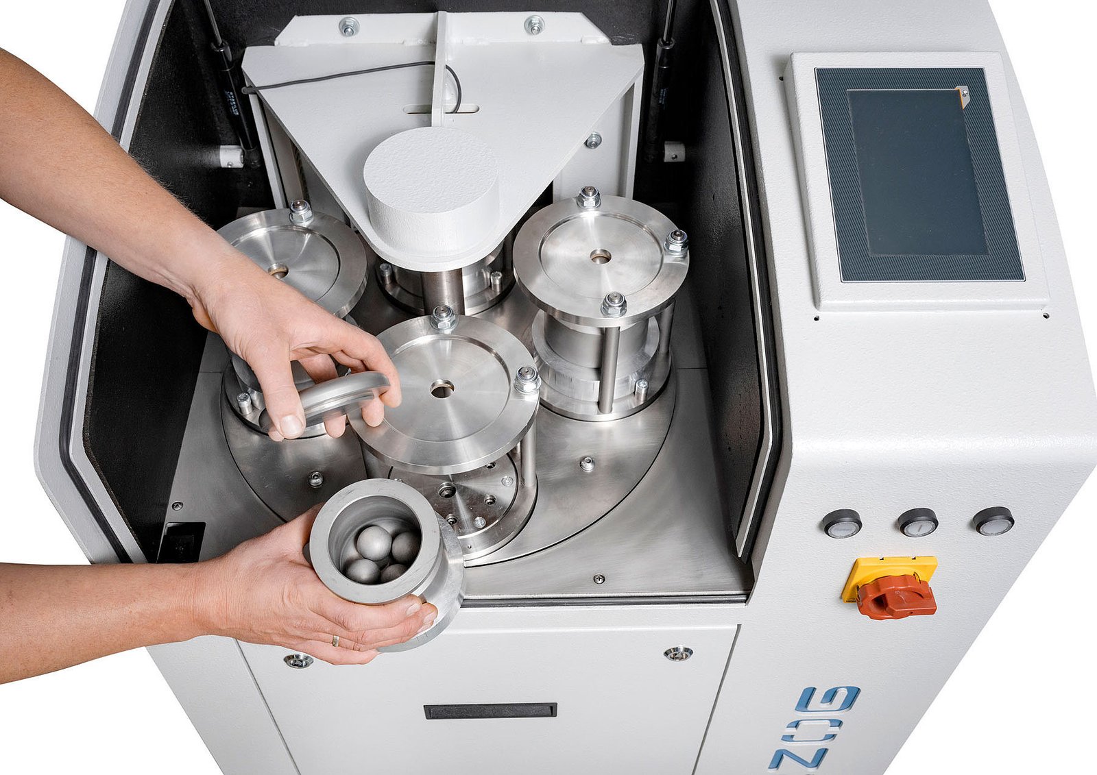 Regardless of whether the machine is integrated into an automatic system, the HP-PKM can be operated manually at any time. To do this, the operator opens the front machine flap and loads the jars into the grinding positions.