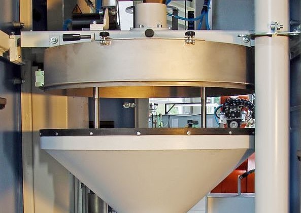 The design of the HP- RSD/S considers several criteria which has to be accounted to ensure a small increment delimitation error. The sample is introduced to the HP- RSD/S via a coated or polished steel cup. Subsequently, the material is poured on a vibration feeder. The cup emptying is realized by a slow and constant tilt-turning movement to minimize the development of fine dust and reduce loss of material. This procedure also reduced the possibility of material hump build-ups influencing the splitting result by varying the material feed rate. Vibration introduced material transport is the best technical approach to provide a constant material stream.