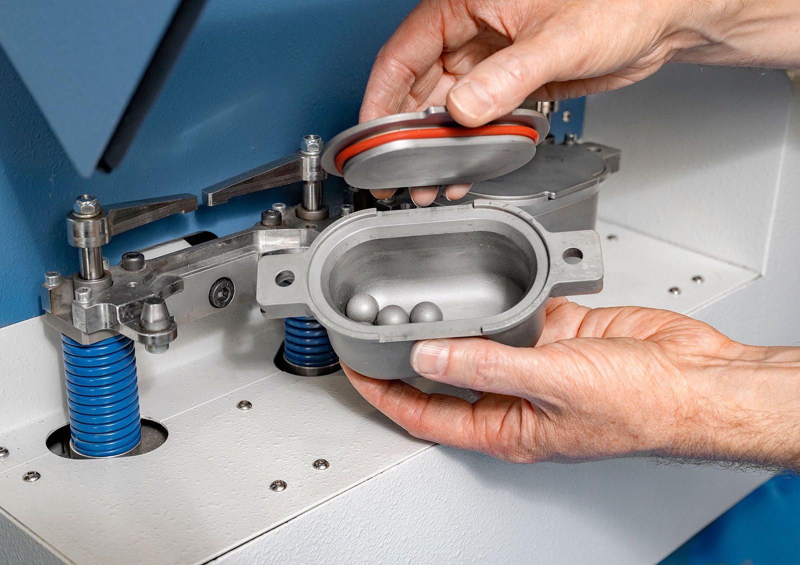 The grinding jar is placed on the conical mandrels of the grinding jar holder via the openings on the side arms. It is then clamped with the help of the two clamping fingers, which are guided over the grinding jar lid and press it down at the same time. A spring mechanism holds the clamping fingers in position and prevents the grinding bowl from moving. The spring force is designed in such a way that the grinding vessel seal retains even the smallest grain size fractions highly effectively.