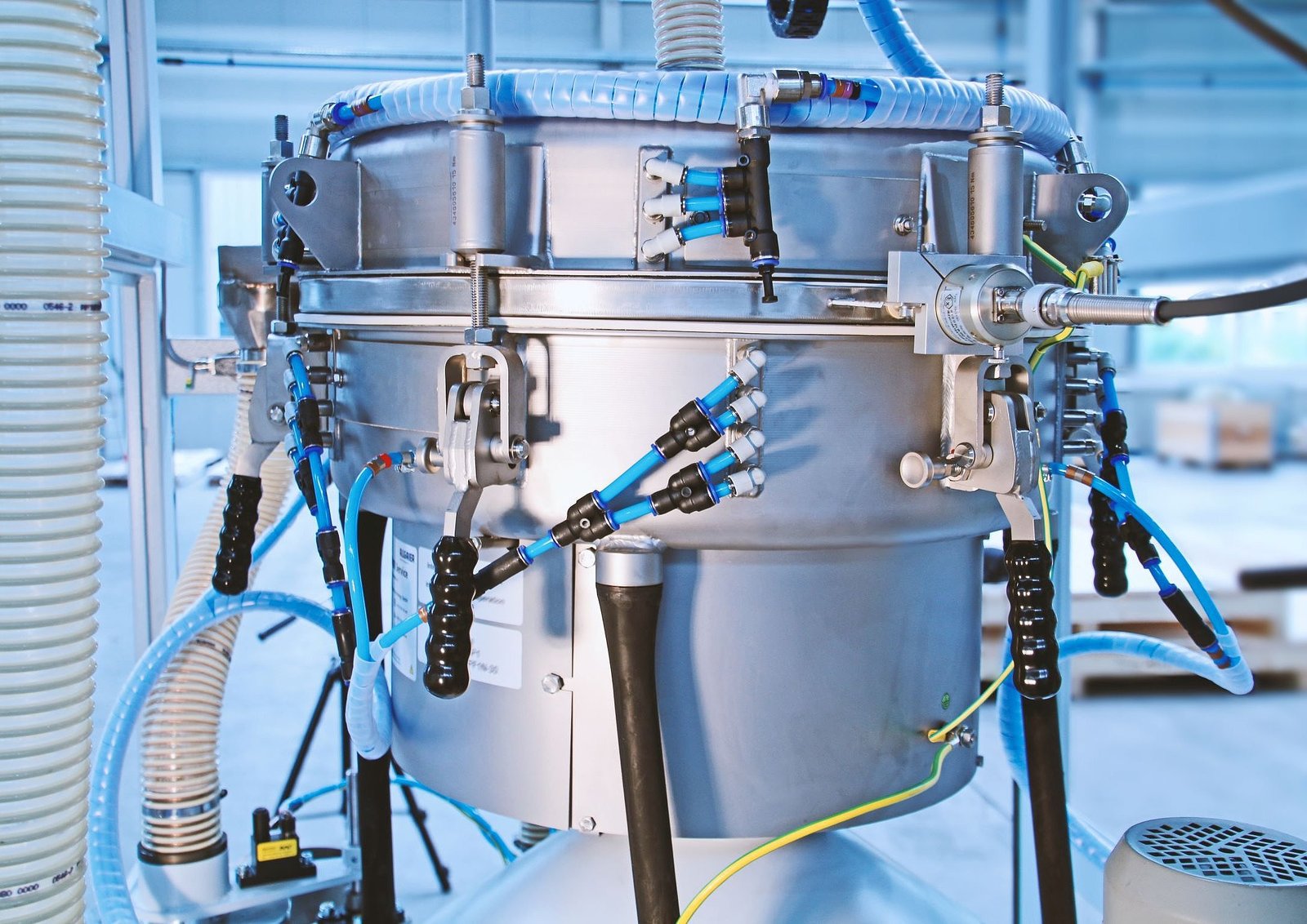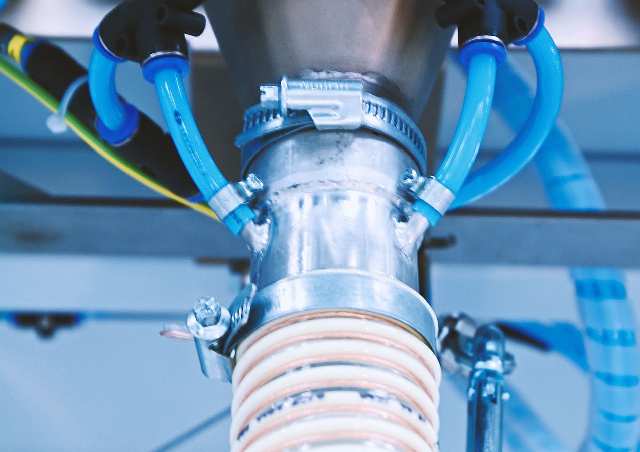 The HP-STM has highly efficient cleaning mechanisms. After completion of the sieving process, the feeding unit, sieving machine and outlet hoses are cleaned using compressed air and simultaneously exhausted. Vibrators in the area of the feed nozzles and hoses also ensure that any material residues are removed. In addition, the surfaces of the input hopper are coated according to the type of material in order to prevent possible build-up in this area.