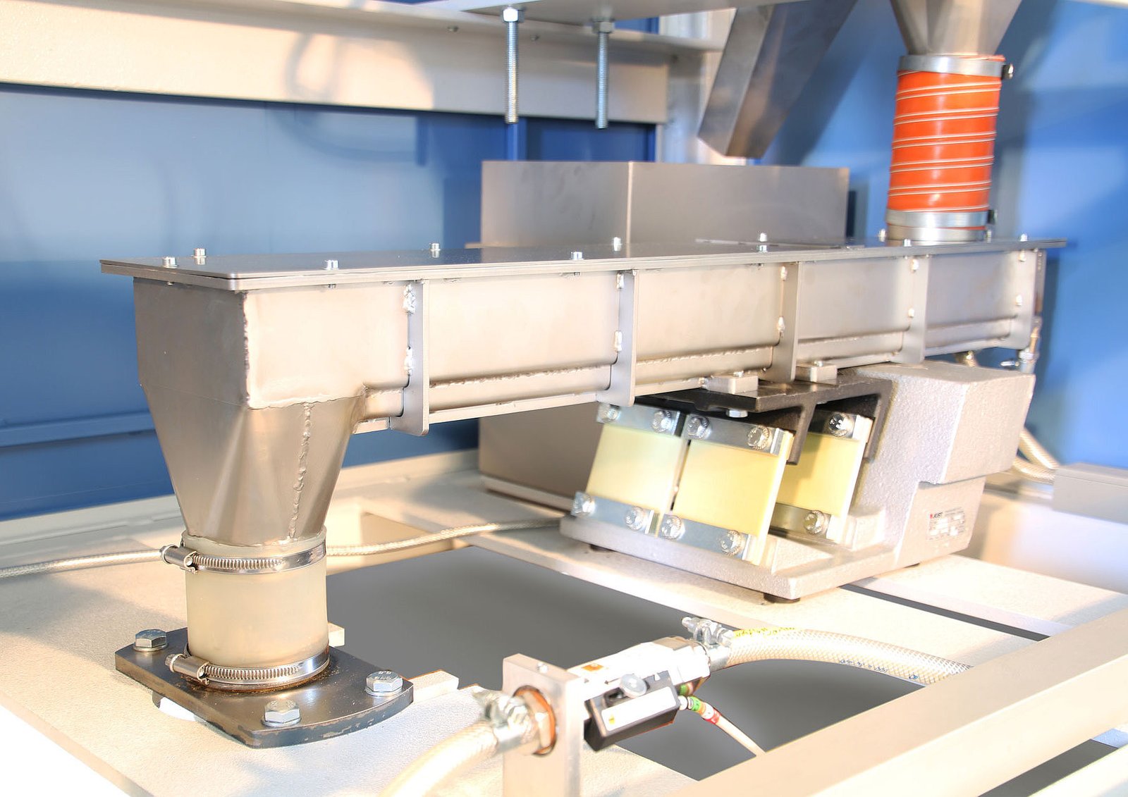The HR-KNH sampler is designed for the sampling of hot powder and fine-grain material from inclined drop shafts. A linear conveyor transports a spoon into the material stream. After the retraction and unloading of the spoon, the material falls through a funnel into the sending station. The system can be used for both cross-sectional and random spot sampling. The sample quantity can be adjusted by control of the sampling strokes. The sampling cycle can be controlled by the PLC of a process station.