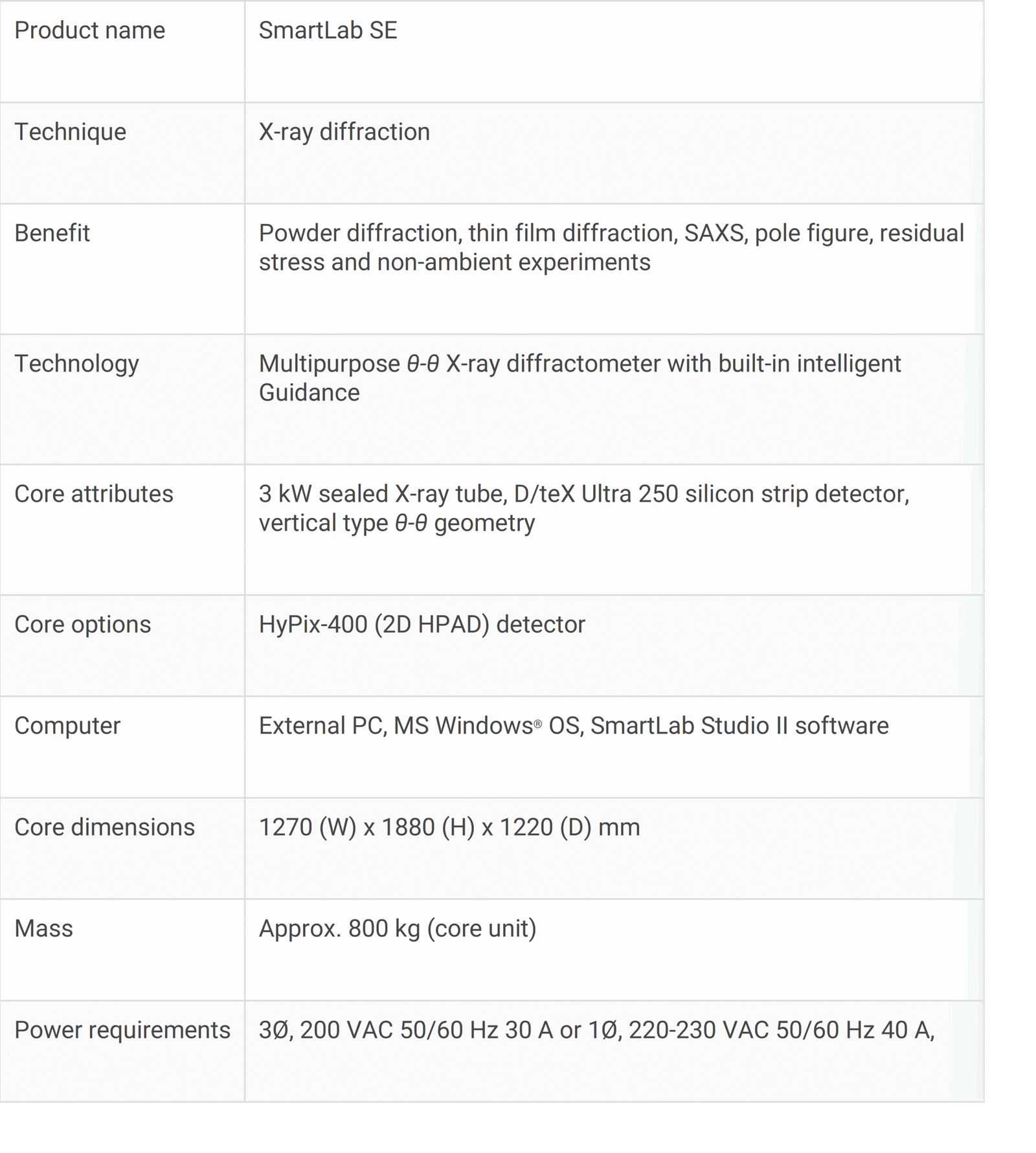 The SmartLab® SE is a highly versatile multipurpose X-ray diffractometer with built-in intelligent guidance. It offers continued refinement of the original ease of use features that enabled the original SmartLab to receive the R&D 100 Award in 2006: automatic alignment, component recognition, cross beam optics and advanced photon counting hybrid pixel array detectors (HPAD).