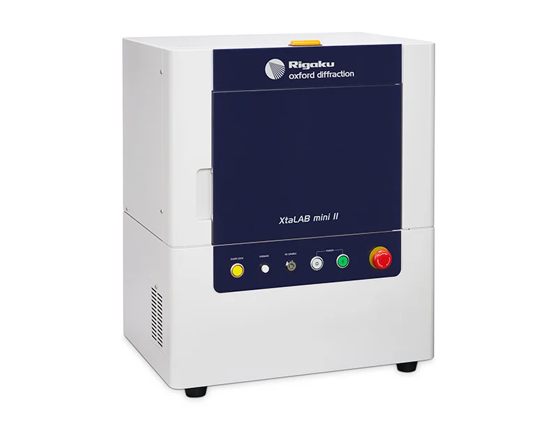 The Rigaku XtaLAB mini II is a research-grade chemical crystallography diffractometer that sits on the benchtop. No data quality compromises. Results delivered are unambiguous. X-ray source tube lifetime is extended by running a standard off-the-shelf X-ray tube at 600 W. To compensate for running at a lower power, a SHINE optic (special curved monochromator) is utilized to produce usable X-ray flux comparable to a standard X-ray diffractometer. In addition, the XtaLAB mini II is equipped with a state-of-the-art two-dimensional semiconductor detector that is characterized by extremely low background noise and high sensitivity. These detector characteristics mean that, for weakly diffracting samples, longer scan rates can be employed without the weak diffraction signals being swamped by detector noise.